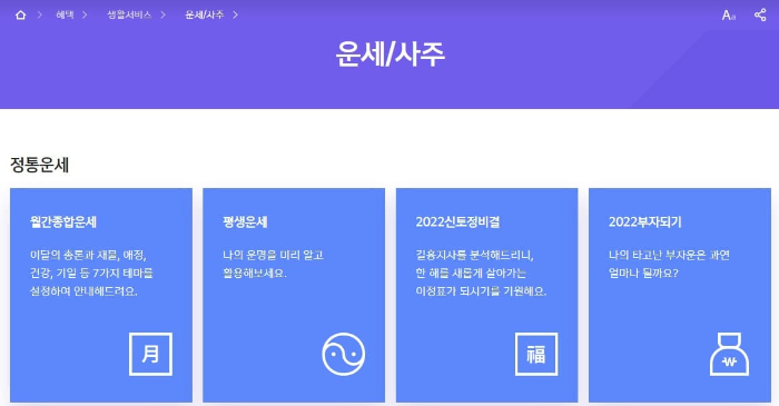 신한 라이프의 무료 운세보기 서비스는 사람들이 가장 많이 이용하는 곳입니다. 그만큼 신뢰도가 높다는 거겠죠. 이곳에서도 토정비결, 평생 운세, 궁합 등을 볼 수 있습니다.